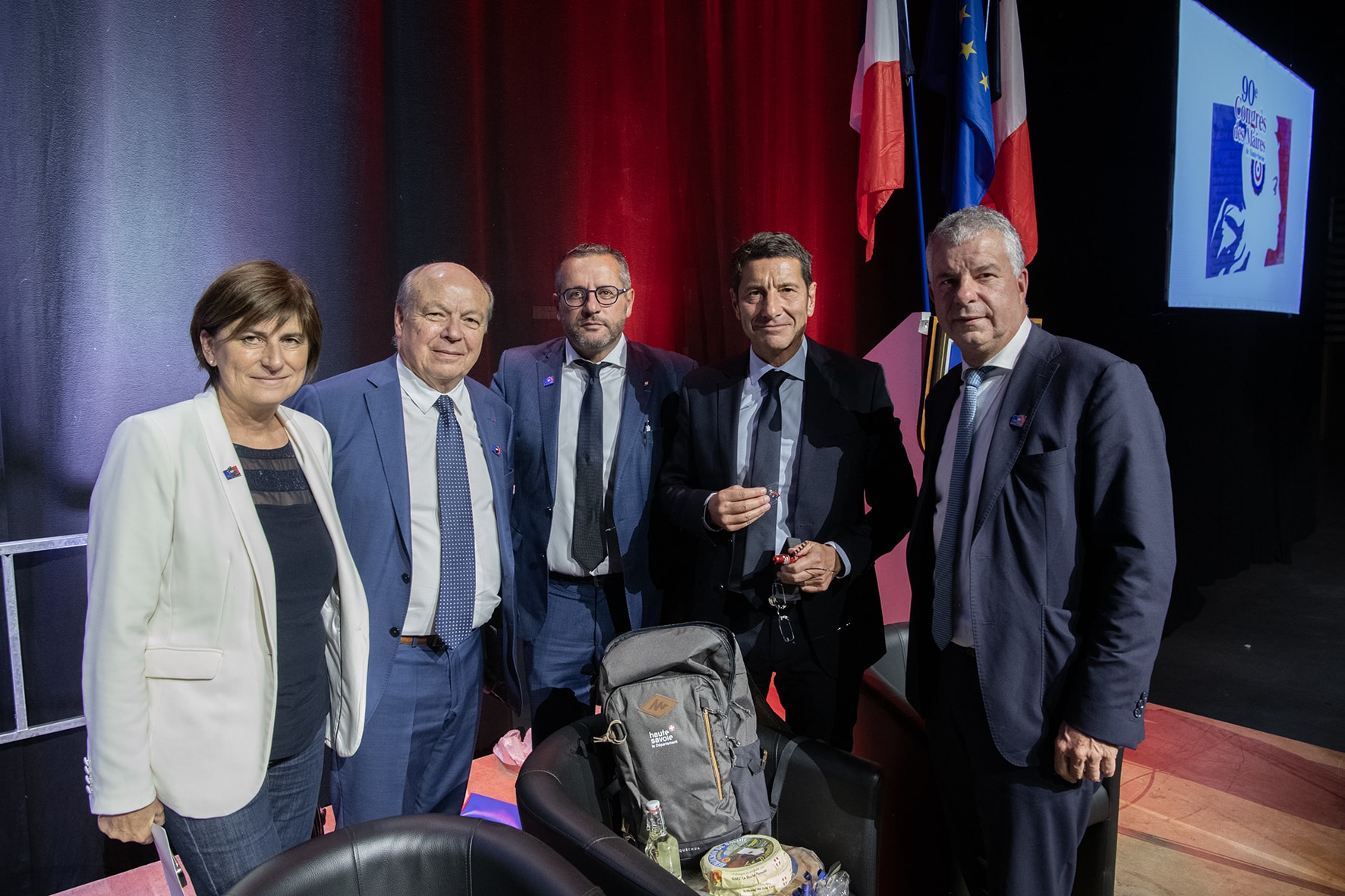 Nicolas Rubin, président de l’association des maires de Haute-Savoie et 1er vice-président de CD74 accompagné de Martial Saddier, président du Conseil départemental de la Haute-Savoie; Christian Dupessey, Laetitia Venner ; menbres de l’ADM 74 ; Yves Le Breton, préfet avec comme invité d’honneur David Lisnard, président de l’Association des Maires de France, lors du 90ème congrès des maires de Haute-Savoie à La Roche-sur-Foron.